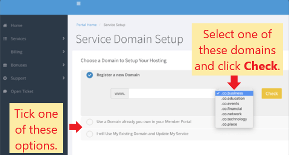 Paso 1 : Elija un nuevo nombre de dominio (incluido) o ingrese su nombre de dominio existente en supanel de control de Ocho alojamientos web .